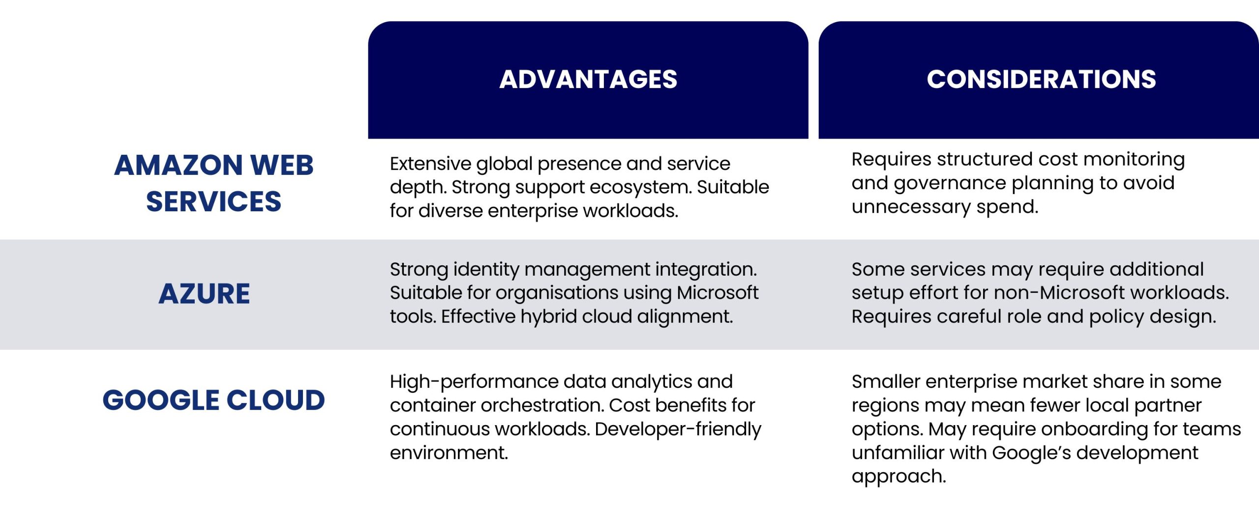 GCP has a reputation for strong analytics performance and efficient handling of distributed workloads, making it a compelling choice for organizations working with large datasets or advanced data modelling. It also offers a developer-friendly environment that encourages containerized and microservices-based application design.
